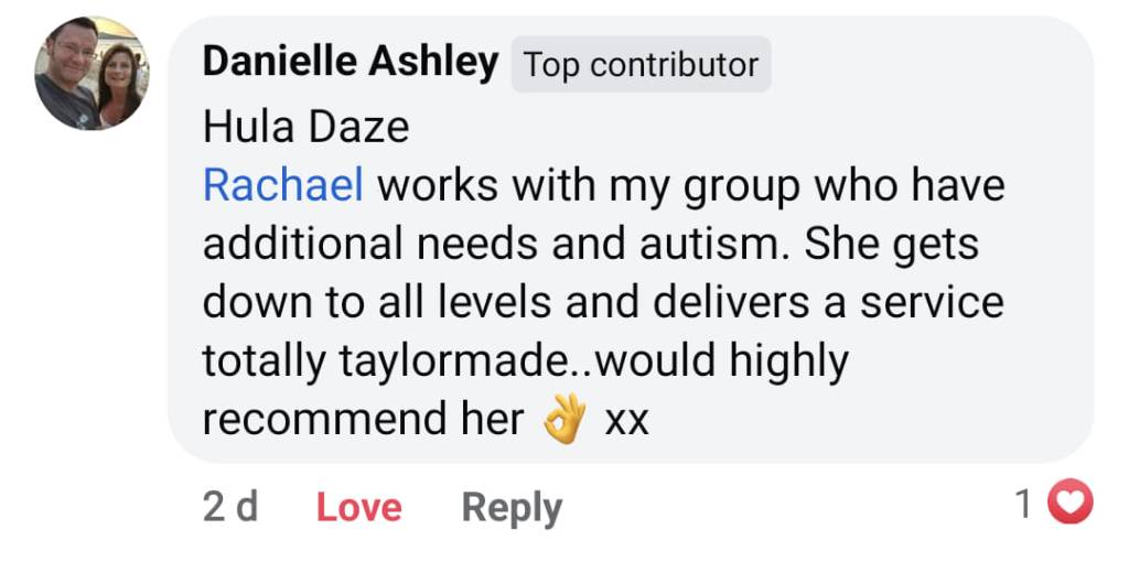 Heather Spencer -Fantastic Hula tuition from Rachael. She starts with the basics and then builds up your confidence to try more and more little tricks that she then builds up into snazzy little routines. Rachael always has a smile on her face she provides truly inspiring tuition that’s great fun. Her classes always boost my mood. Thank you, Rachael!