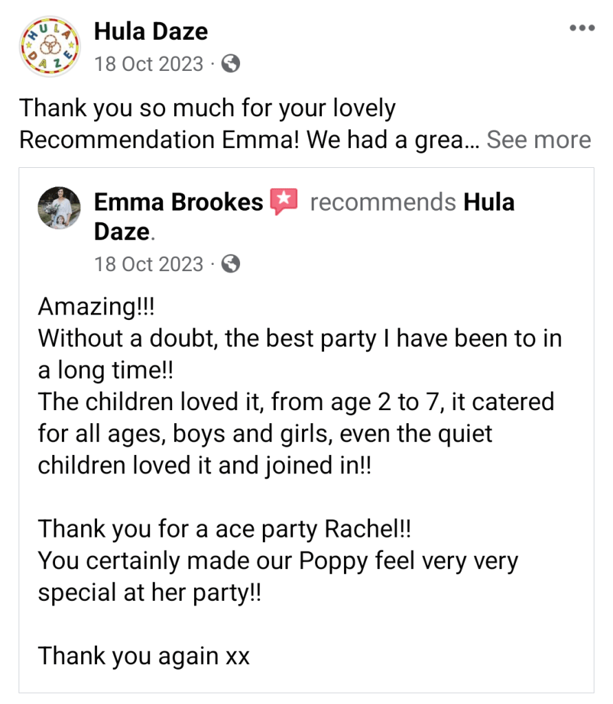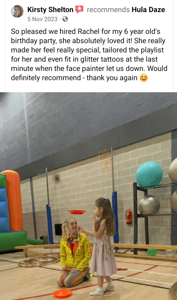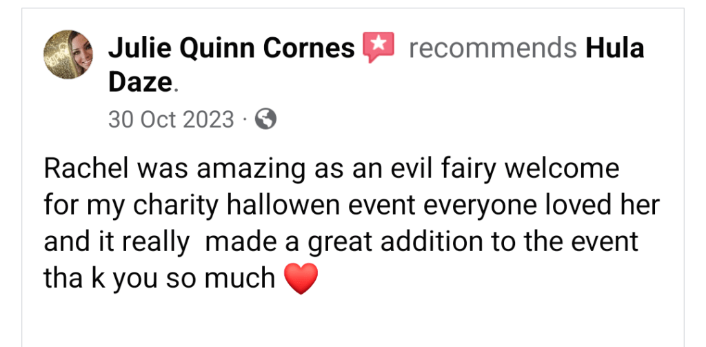 Kelly Mainwaring · I attended an event with my children and Hula Daze was there. She was lovely and friendly, she was amazing with all the children and they all loved seeing her circus skills.